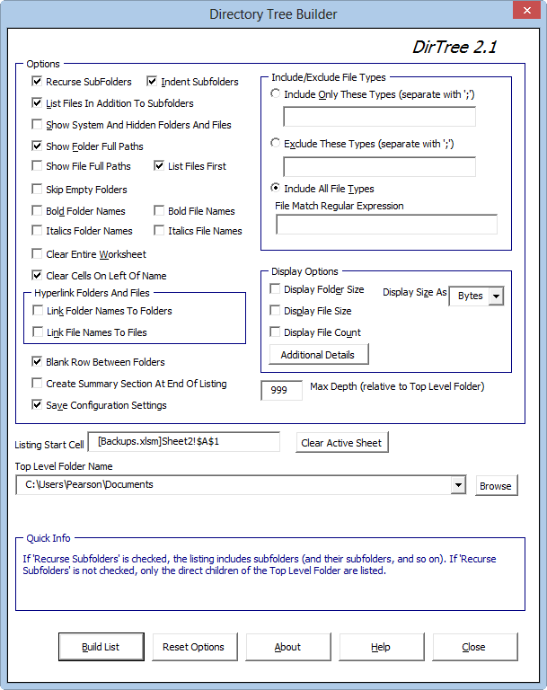 DirTree will create a tree-like hierarchical list of all the folders and (optionally) files contained within a specified directory. When you load the Add-In, an item with the caption Build Directory Tree is created on your Tools menu. When you click that item, the Directory Tree Configuration screen, described below, will appear. You can set the various options of the tree from the configuration screen.